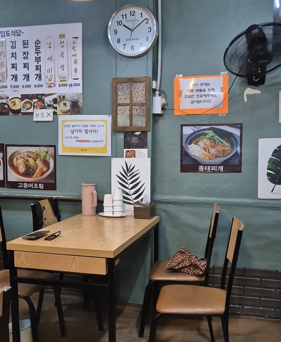 거기서 저희가 들어간 곳이 바로 영도식당. 작고 정겨운 외관에 이끌려 들어갔고, 안에는 테이블 몇 개만 놓인 아담한 공간이었어요. 메뉴는 갈치조림, 고등어조림, 오징어볶음, 된장찌개, 김치찌개 등 딱 밥 생각나는 찬들로 구성되어 있더라고요. 정말 좋은 점이 메인메뉴를 주문하면, 반찬을 뷔페처럼 이용할 수 있다는 점이죠!